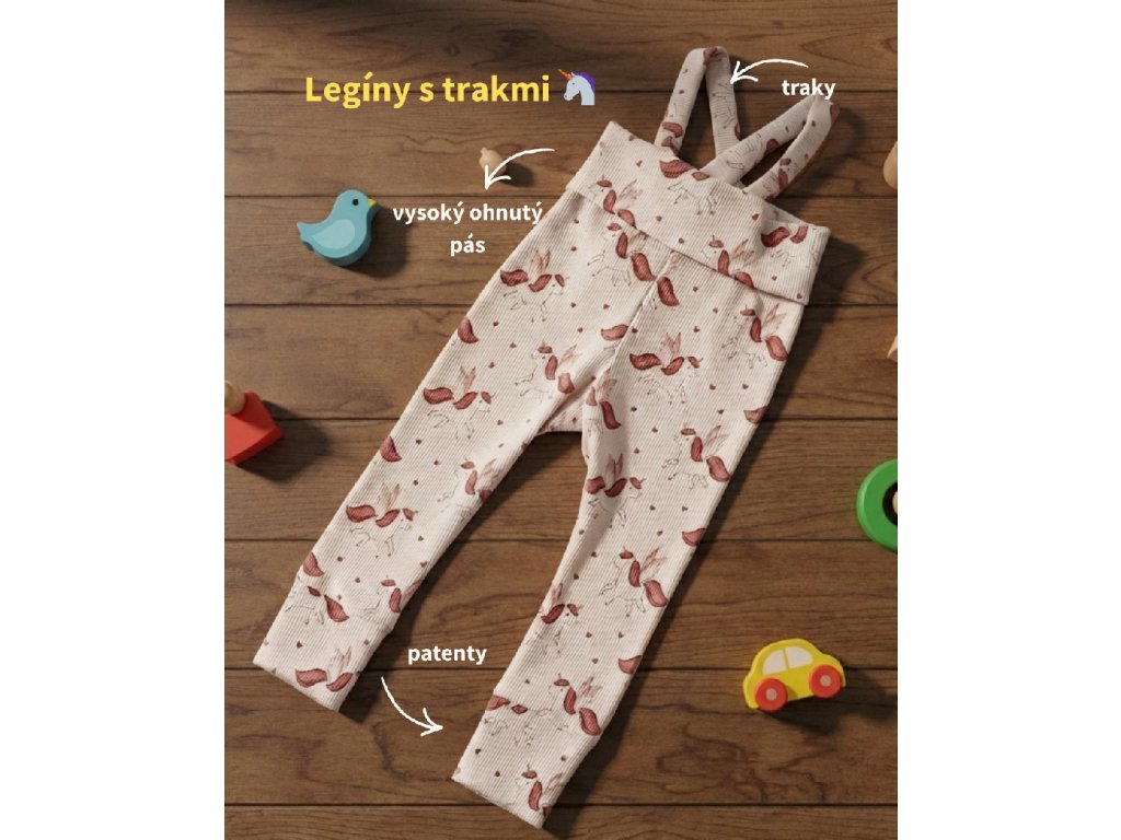 Traky a ohrnutý pás pridávajú legínam originálny vzhľad a dodávajú im roztomilosť. Zároveň sú funkčné, pretože eliminujú potrebu neustáleho naťahovania pása, čo ocenia najmä rodičia aktívnych detí.